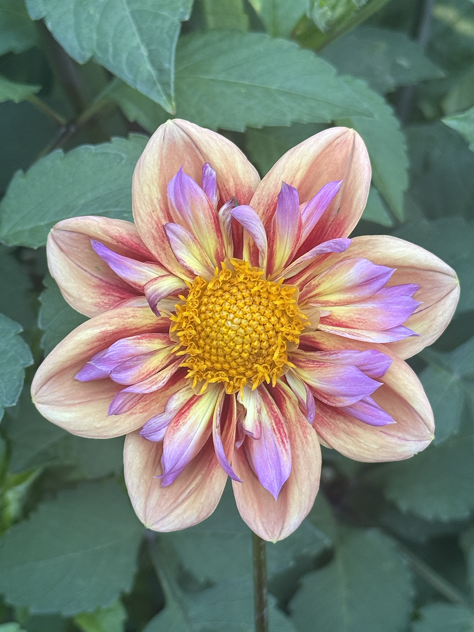 This unusually colored rare collarette features orange petals with lavender petaloids.